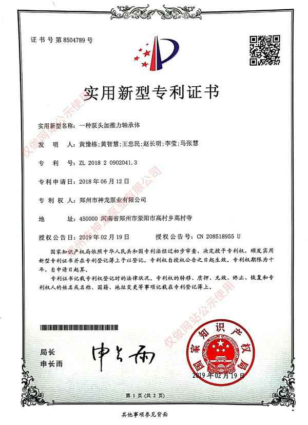 泵头加推力轴承体专利证书